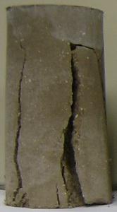 在素土中加入纖維和水泥都能起到提高強度的目的,且提高幅度基本處于同一水平(175-200%),其中素土的強度為0.16MPa,纖維土和水泥土的強度分別為0.44和0.48MPa。但素土、纖維土和水泥土的破壞特征各不相同:素土表現為應變軟化的塑性破壞;水泥土表現為完全的脆性破壞,土體強度瞬間喪失,形成的破壞裂隙寬大,相互貫通(圖2(a));纖維土則表現為應變硬化的塑性破壞,破壞后土樣中發育的裂隙相對比較細小,呈現裂而不斷的特征(圖2(b)),這對工程結構的穩定性有重要意義。此外,當在纖維土中再加入水泥后,強度得到成倍增加,達到1.18MPa,遠遠超過單純的纖維土和水泥土強度之和,說明二者配合使用增強效果更佳,能極大減少材料用量,節約工程成本。