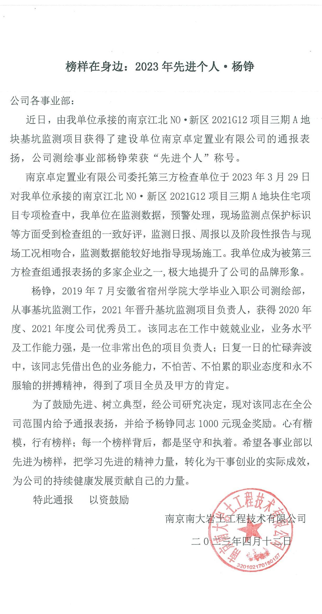 喜報“榜樣在身邊:2023年先進個人·楊錚”